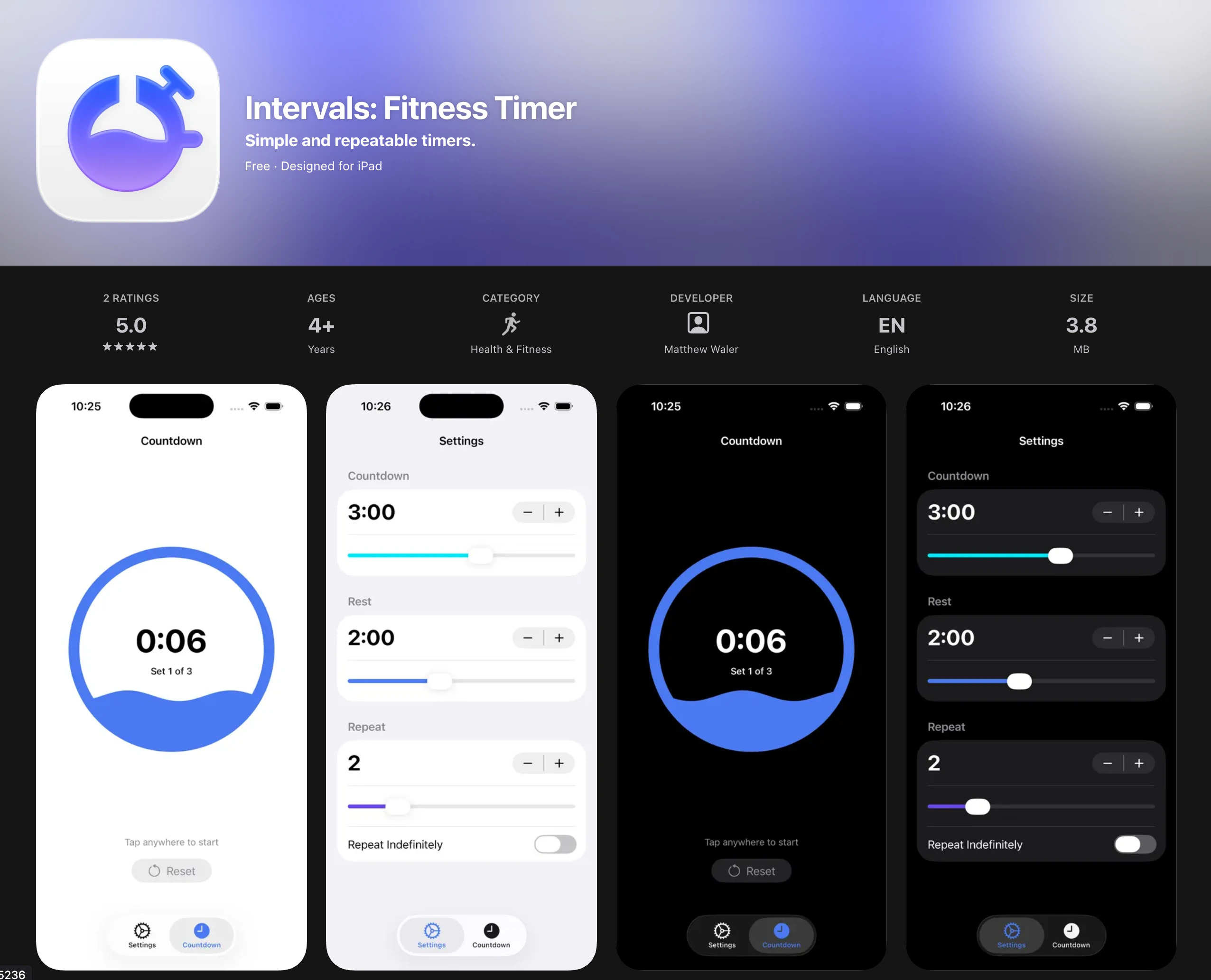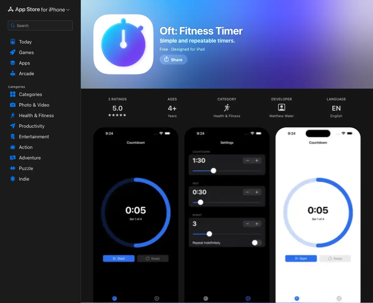 A no-fuss fitness timer that allows a user to customize timer duration, repeats, and rest time.